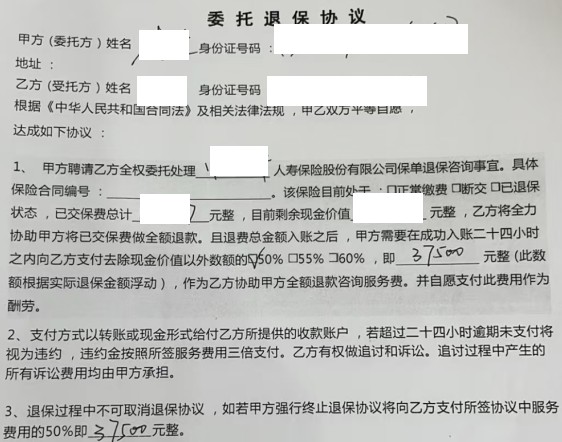 起初,李先生與所謂的“某律師”簽訂了一份委托退保協(xié)議,并聽從對方的要求編造虛假理由多方投訴保司。太平人壽工作人員多次邀約客戶面談但均被回絕,為取得客戶的信任,公司申請當?shù)氐娜嗣裾{(diào)解委員會出面調(diào)解。在調(diào)解過程中,公司工作人員指出了該委托退保協(xié)議中存在的明顯漏洞——無論退保成功與否客戶都需向?qū)Ψ嚼U納一筆近4萬元的手續(xù)費。隨后當客戶撥通電話質(zhì)問這位“律師”時,對方果然原形畢露,并威脅將依據(jù)該協(xié)議內(nèi)容上門追討。最終,客戶選擇報警處理,同時感謝太平人壽和調(diào)解員的耐心勸導,并辦理了保單復效手續(xù)。