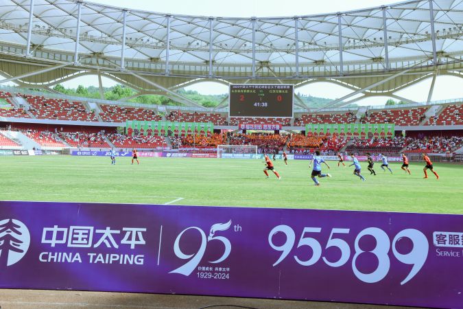 在20名太平人壽員工身著“中國太平”志愿者服裝組成的旗手隊手持中國太平標(biāo)志的中圈地鋪入場后,山東與江蘇兩支隊伍展開了激烈的對決。在助威團的吶喊聲中,雙方隊員都展現(xiàn)出了出色的競技狀態(tài),經(jīng)過90分鐘的角逐,雙方最終以2:2握手言和,精彩的比賽贏得了現(xiàn)場觀眾的陣陣掌聲和喝彩。