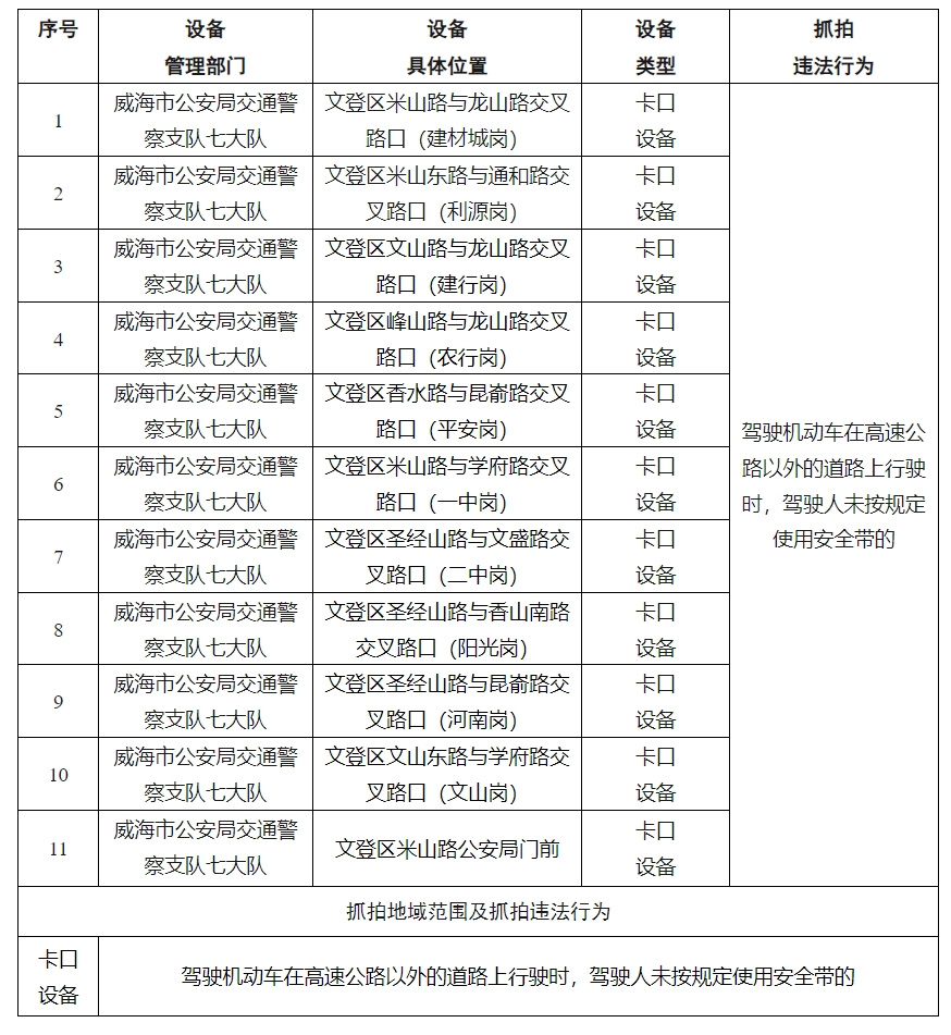 為保證道路交通安全,預(yù)防和減少交通事故的發(fā)生,根據(jù)《中華人民共和國(guó)道路交通安全法》及其實(shí)施條例等法律法規(guī)和相關(guān)技術(shù)規(guī)范的規(guī)定,依據(jù)《公安機(jī)關(guān)執(zhí)法公開規(guī)定》,現(xiàn)將文登區(qū)啟用的11處共11個(gè)交通技術(shù)監(jiān)控設(shè)備予以公示,自4月9日起,將對(duì)有關(guān)交通違法行為進(jìn)行依法管理,請(qǐng)廣大交通參與者自覺遵守道路交通法律法規(guī),共同維護(hù)良好的道路交通環(huán)境。