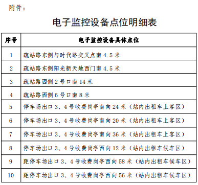 威海站前疏站路西側(cè)2號(hào)口至6號(hào)口之間相關(guān)區(qū)域以及威海站內(nèi)出租汽車待租區(qū)(運(yùn)用的電子監(jiān)控設(shè)備點(diǎn)位詳見(jiàn)附件)。