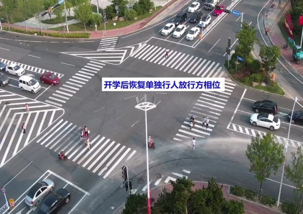 2.調整部分學校周邊路口的放行方式,由單獨行人相位調整為行人跟隨機動車通行,減少綠損,從而提高路口、路段整體通行效率。