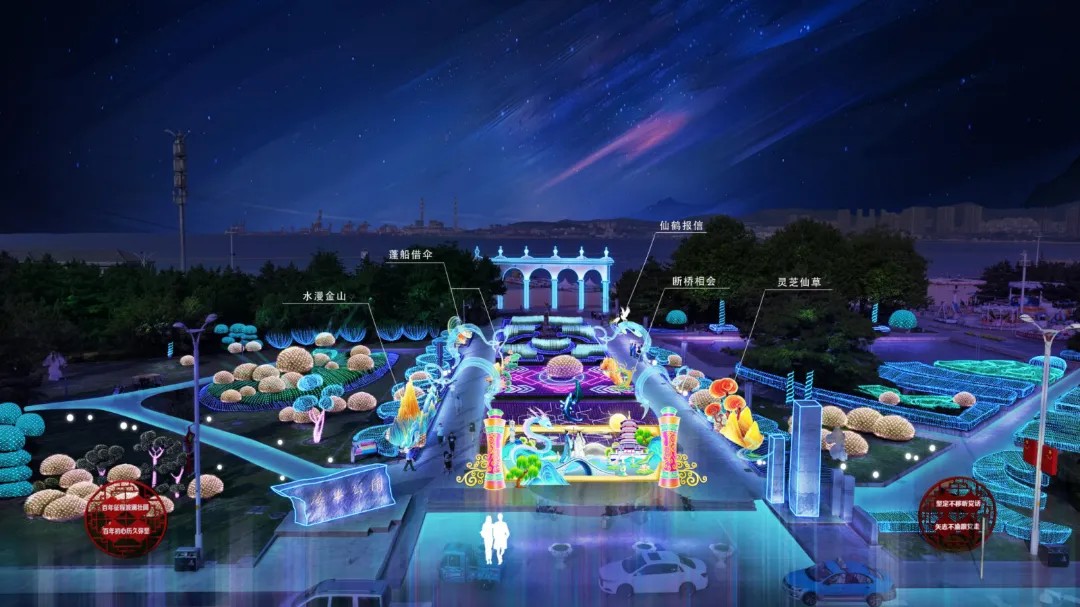 高區(qū)在高新廣場布置一組“山海畫卷”立體景觀,主體造型以卷軸為本,以海洋文化為題材,融入海洋動植物、浪花、祥云、海鷗等元素。廣場四周樹木、草坪上采取紅燈籠、水母燈、詩詞燈柱、網(wǎng)燈等燈飾和“毛衣樹”裝飾進(jìn)行全方位裝點(diǎn),達(dá)到晝夜皆景。同時,在世昌大道、文化路、環(huán)海路、火炬八街等重要路段和重要節(jié)點(diǎn)的行道樹上懸掛燈籠,綠地里布置燈飾。
