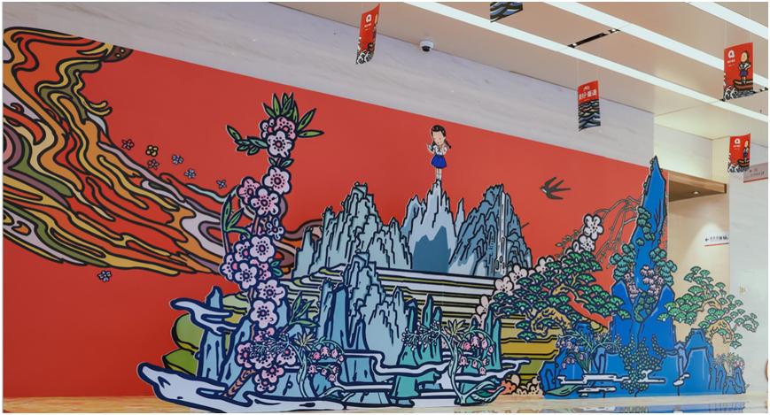 互動(dòng)區(qū)——“送你一朵小紅花” “送你一朵小紅花”互動(dòng)裝置打造了卜樺作品《春風(fēng)拂面》中太陽灑下溫暖光芒、祥云飄逸靈動(dòng)、柳樹輕拂微風(fēng)、山峰屹立巍峨的自然仙境,構(gòu)建出極具沉浸感的互動(dòng)場景。市民朋友可以在花朵貼紙上寫下對(duì)生活、對(duì)未來的美好愿望,并將其貼于背景墻上,用愛與期待編織希望的篇章。