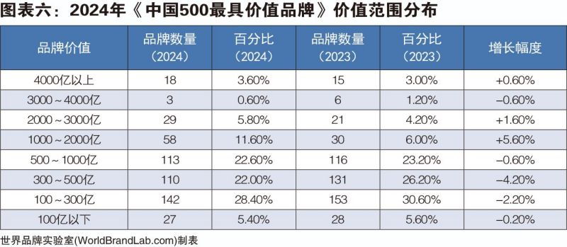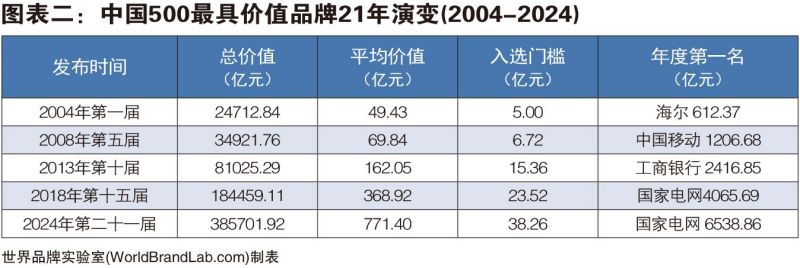 2024年《中國500最具價值品牌》的總價值為38.57萬億元,比去年增加4.24萬億元,增幅為12.35%。世界品牌實驗室學(xué)術(shù)委員會主席、牛津大學(xué)(Oxford)營銷學(xué)榮譽(yù)教授斯蒂芬·沃格(Steve Woolgar) 博士表示:“在過去的20多年中,我目睹了中國品牌的快速成長,有的已經(jīng)具有強(qiáng)大的世界影響力,這些品牌包括國家電網(wǎng)、海爾、中化、華潤、中國南方電網(wǎng)、保利、河鋼、中國華電、五糧液、徐工、青島啤酒、中國國航、北大荒、東方電氣、通威、波司登、飛鶴、中國航油、恒力、協(xié)鑫、圣象、九牧、長虹、雙星輪胎等?!笔澜缙放茖嶒炇揖幹浦袊放茍蟾嬉咽堑?1個年頭,2004年入選門檻僅為5億元,前500名品牌的平均價值為49.43億元。21年以后的2024年,入選門檻已經(jīng)提高到38.26億元,而前500名品牌的平均價值高達(dá)771.40億元,增幅為1460.59%。本年度共有108個中國品牌的價值超過1000億,比去年增加36個,彰顯了中國品牌經(jīng)濟(jì)的繁榮。