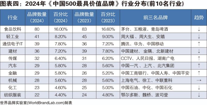 本年度《中國500最具價值品牌》排行榜中,共有來自食品飲料、輕工業(yè)、建材、傳媒、紡織服裝、醫(yī)藥、機(jī)械等在內(nèi)的24個相關(guān)行業(yè)的品牌入選。其中食品飲料業(yè)依然是入選品牌最多的行業(yè),共有80個品牌入選,占總?cè)脒x品牌數(shù)的16.00%;入選數(shù)量位居第二到第五的行業(yè)分別是輕工(41個)、通信電子IT(39個)、建材(36個)、傳媒(32個)。在衡量品牌的忠誠度時,世界品牌實驗室參考了我信品牌(iTrust Rating)的評級數(shù)據(jù);在衡量品牌的領(lǐng)導(dǎo)力特別是ESG(環(huán)境、社會和治理)評分時,參考了超級財經(jīng)(SuperFinance)的ESG數(shù)據(jù)庫。同時還借用了低碳國際(Carboncare International)對品牌企業(yè)碳排放的計量,以推動品牌添加“碳排放評分”標(biāo)簽。